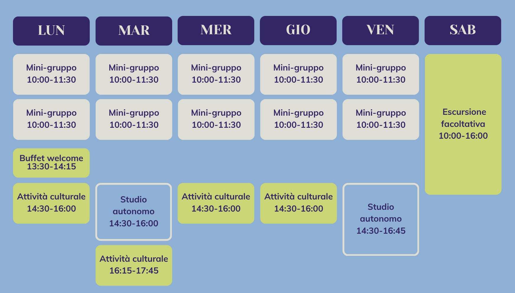 *Questo è un programma di esempio. L’orario effettivo può variare a seconda della settimana e delle attività previste.