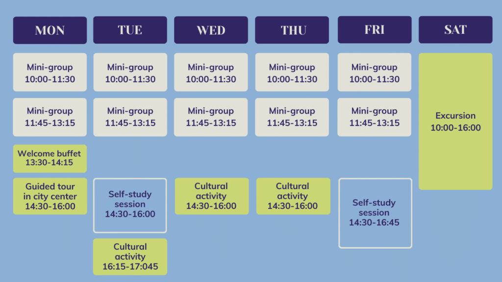 This course combines morning mini-group Russian lessons with two afternoon self-study grammar sessions, at least four cultural activities, and a Saturday excursion. It is designed to help you build strong language skills while giving you the chance to discover Russian culture in an engaging way.